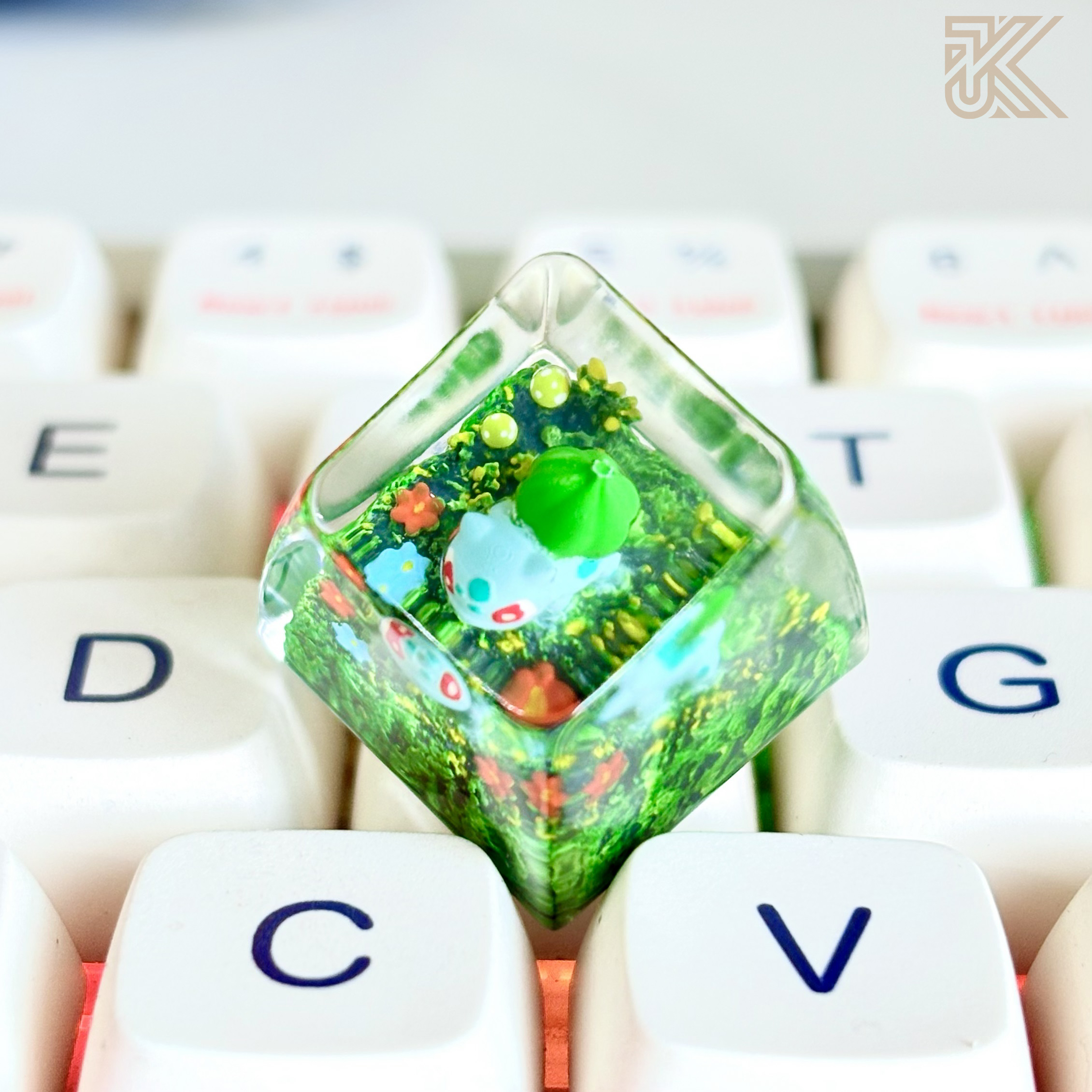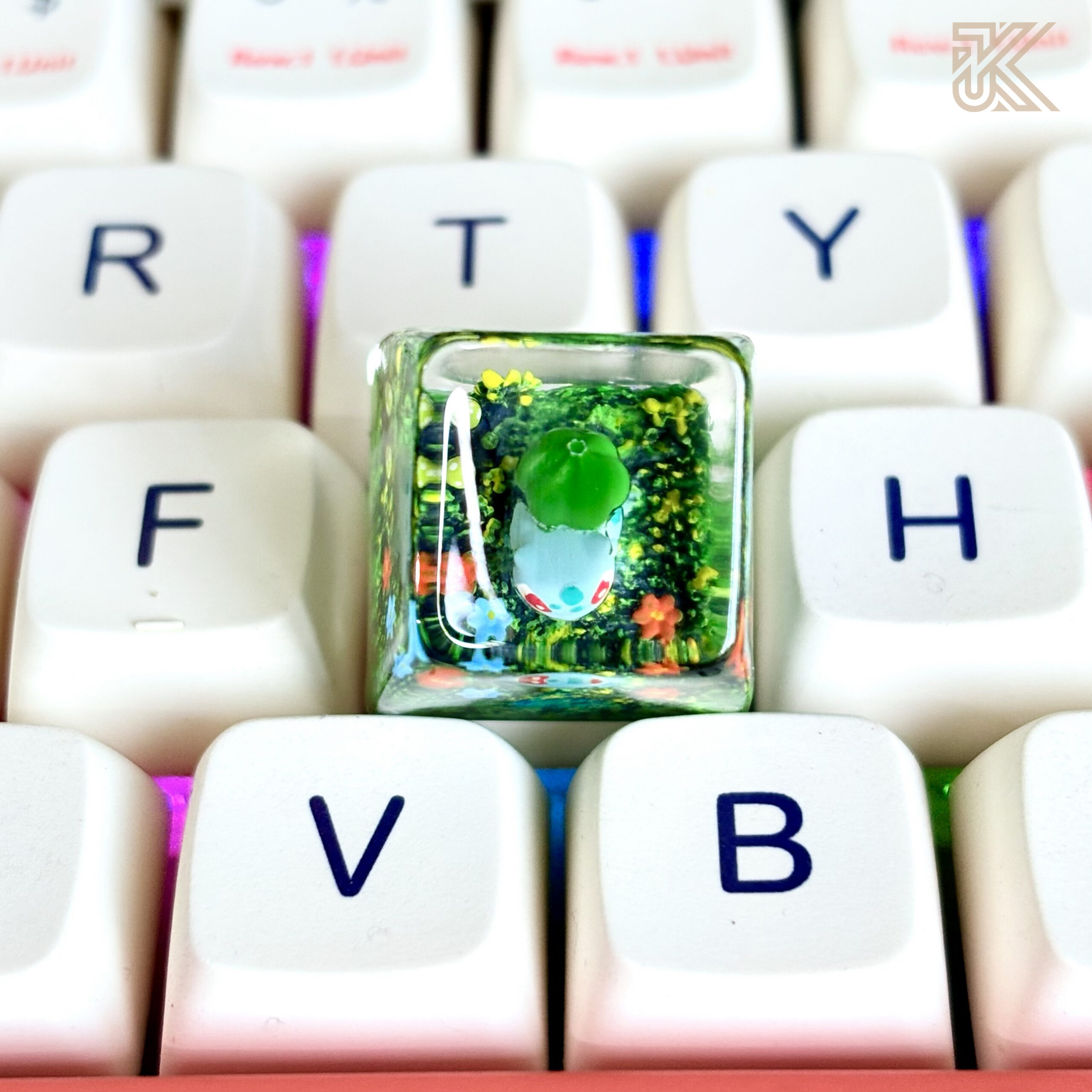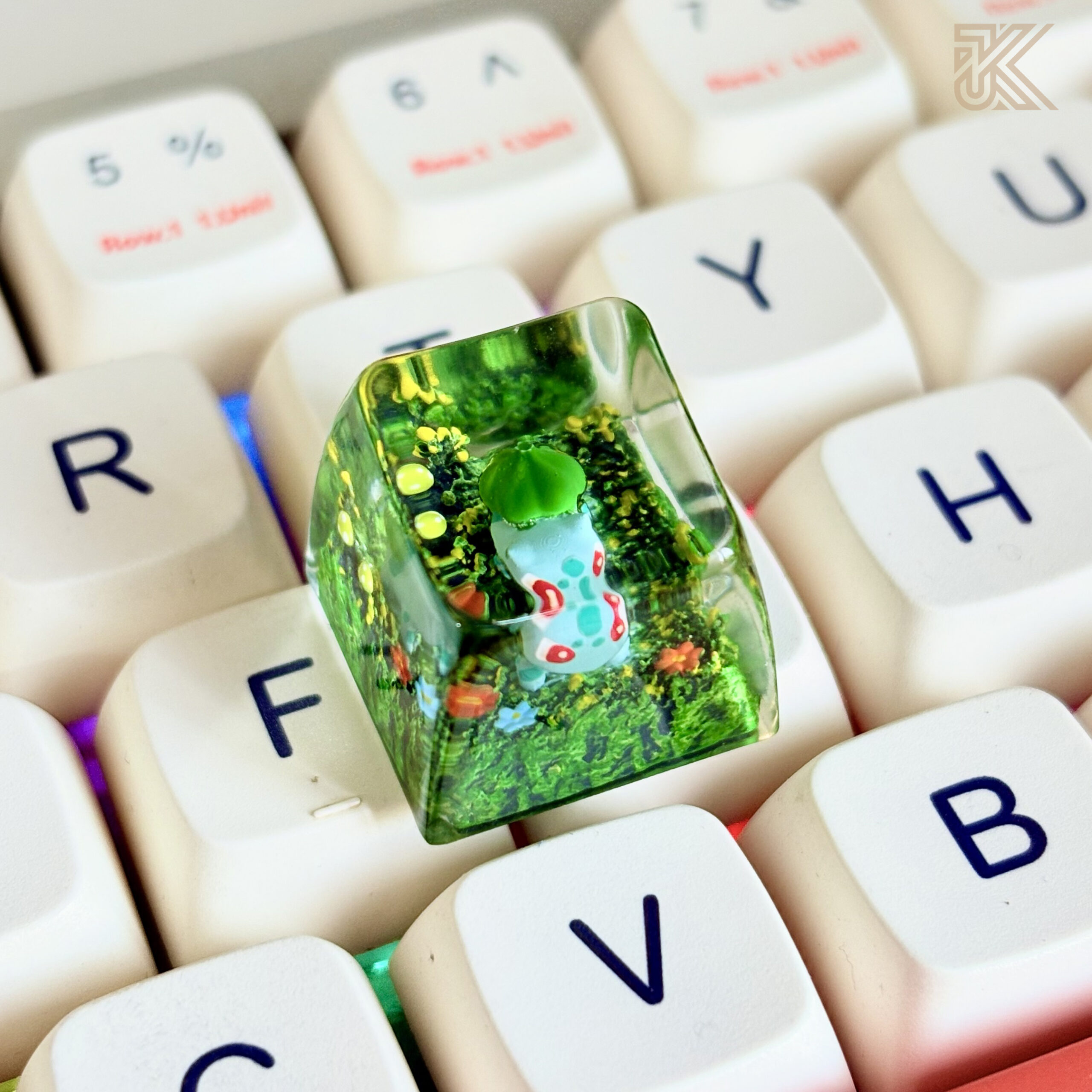Upgrade your mechanical keyboard with this handcrafted Bulbasaur keycap, featuring a detailed 3D design encased in premium transparent resin with a miniature moss terrarium effect. A perfect collectible keycap for Pokémon fans and keyboard enthusiasts.