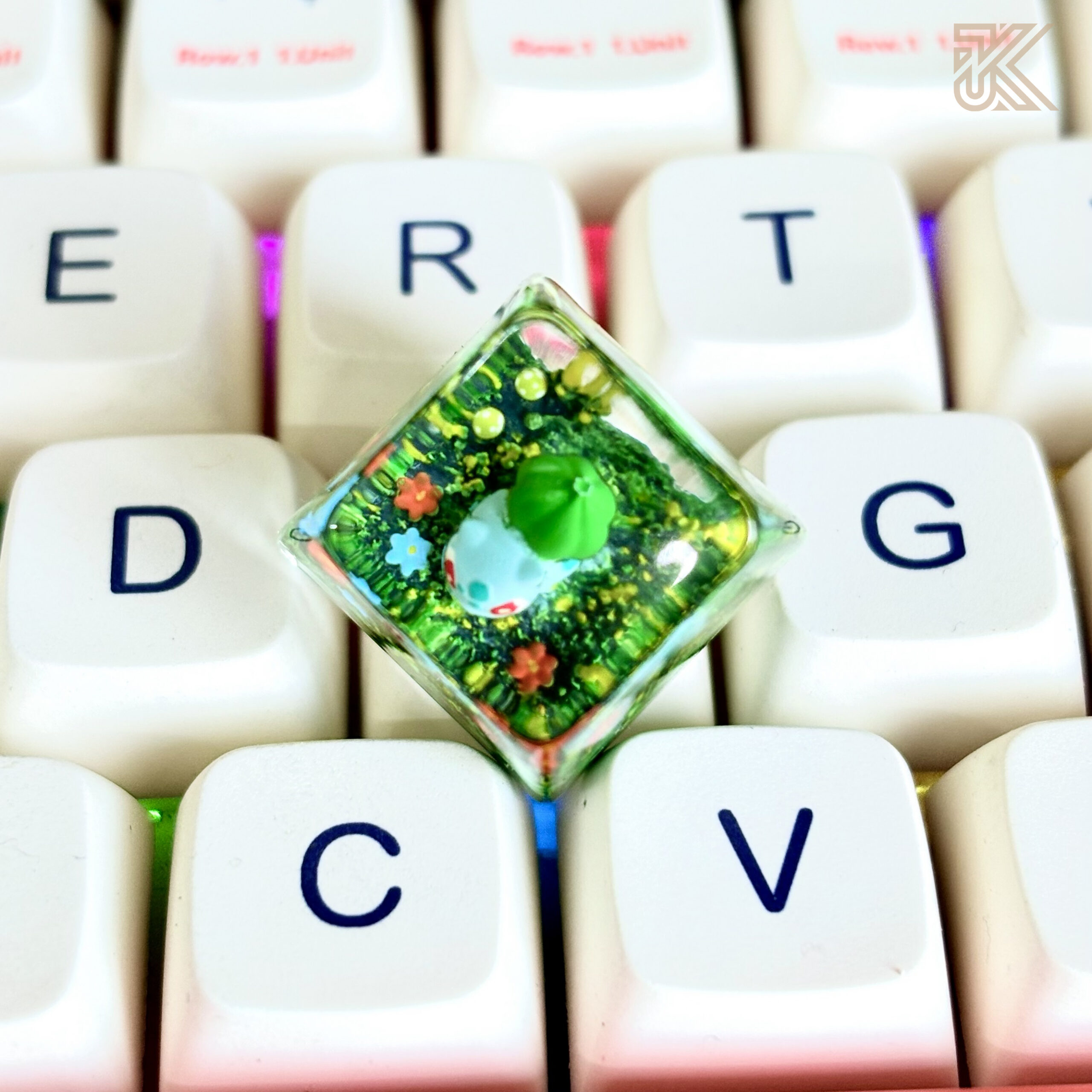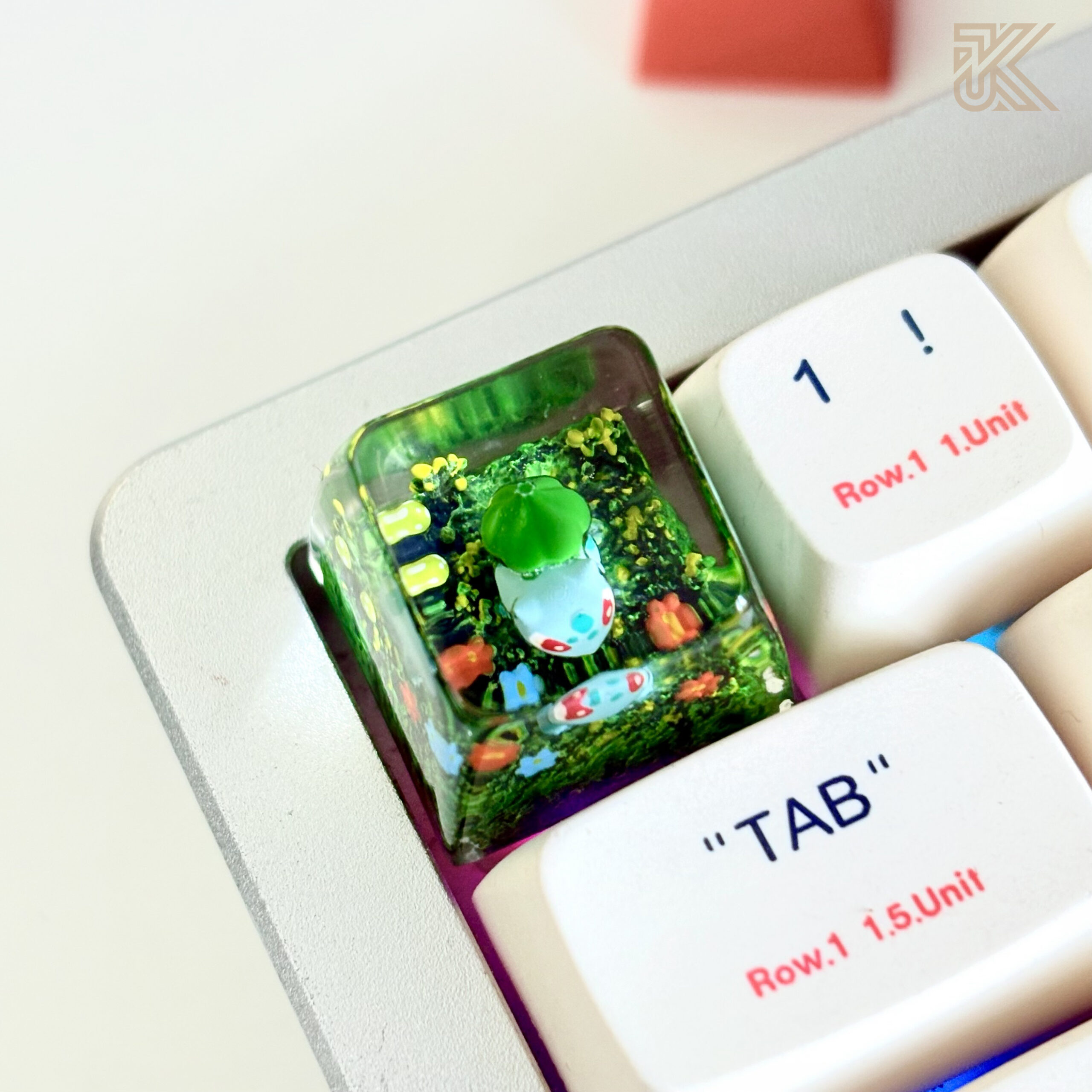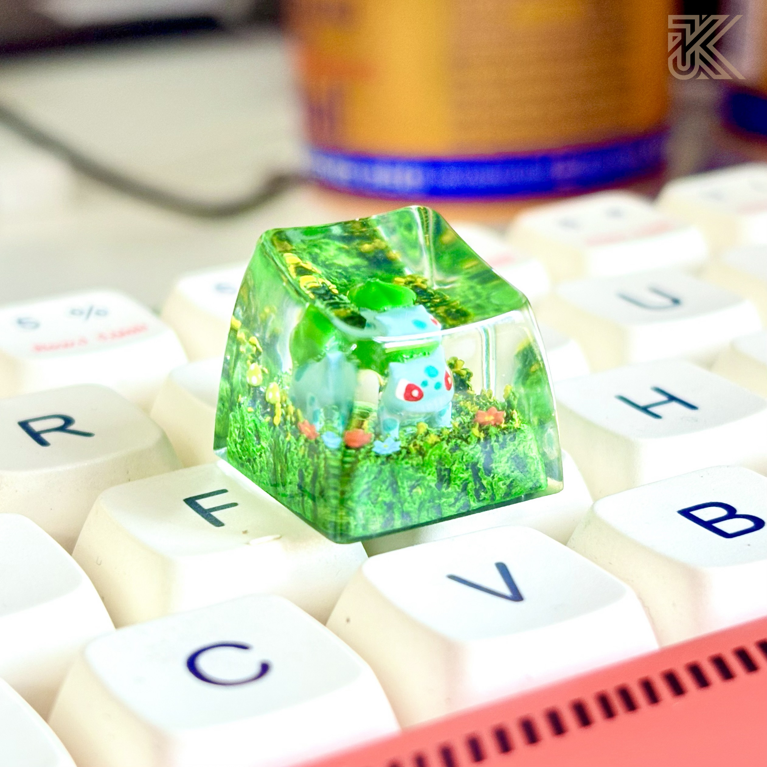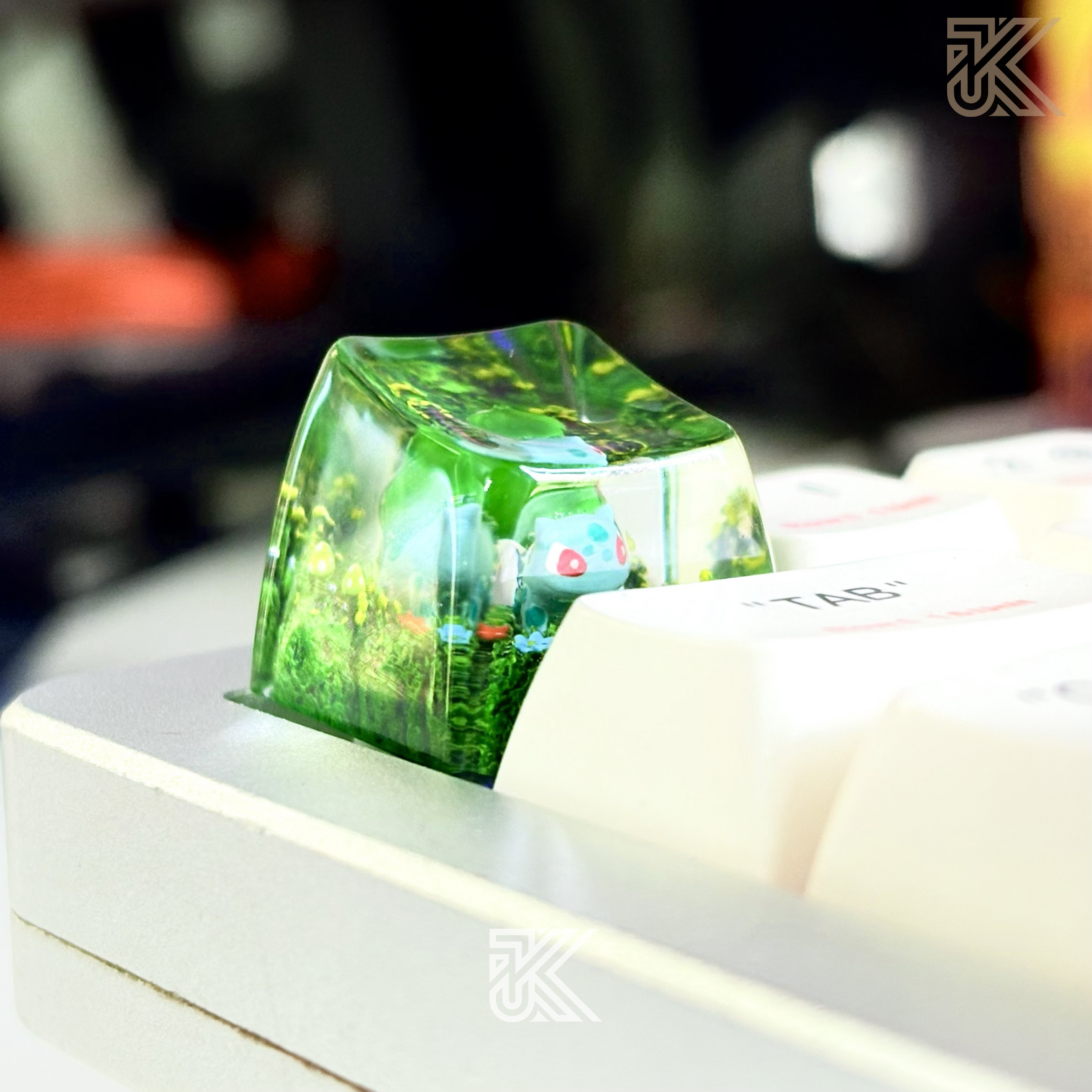 Upgrade your mechanical keyboard with this handcrafted Bulbasaur keycap, featuring a detailed 3D design encased in premium transparent resin with a miniature moss terrarium effect. A perfect collectible keycap for Pokémon fans and keyboard enthusiasts.