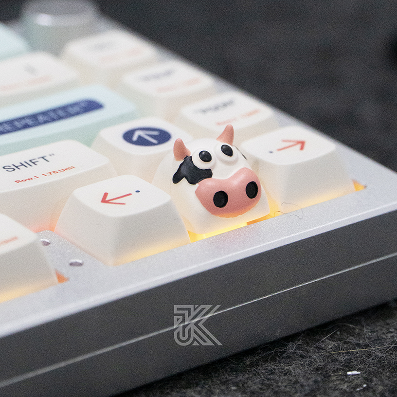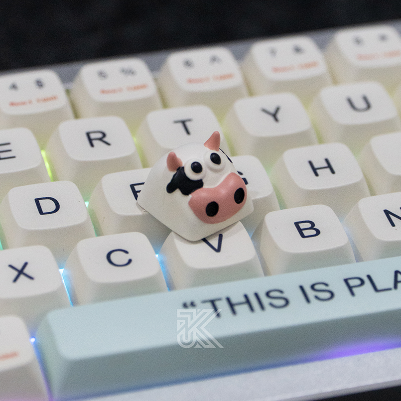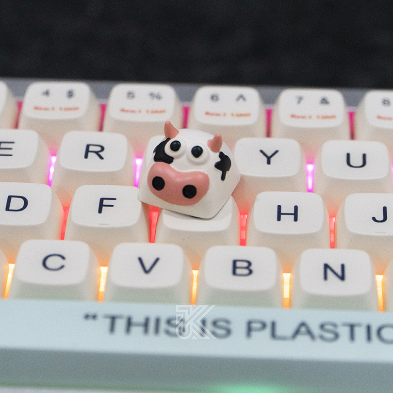 Bring the charm of the farm to your keyboard with the Cow Keycap from Junkeycap. This handmade artisan keycap features a playful cow design with expressive eyes, a pink snout, and soft white horns — crafted to perfection for cow lovers and collectors alike.